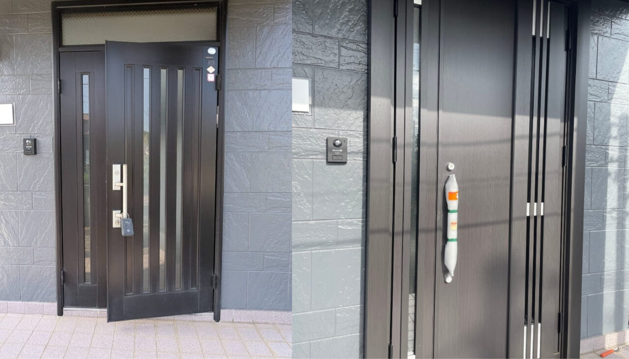 色やデザインは元とほぼ同じですが、細部の仕上げやドアの質感の向上により、玄関全体がすっきりと洗練された印象に変わりました。住宅の外観に自然に馴染みながらも、ちょっとした高級感やおしゃれさが感じられる玄関に仕上がっています。