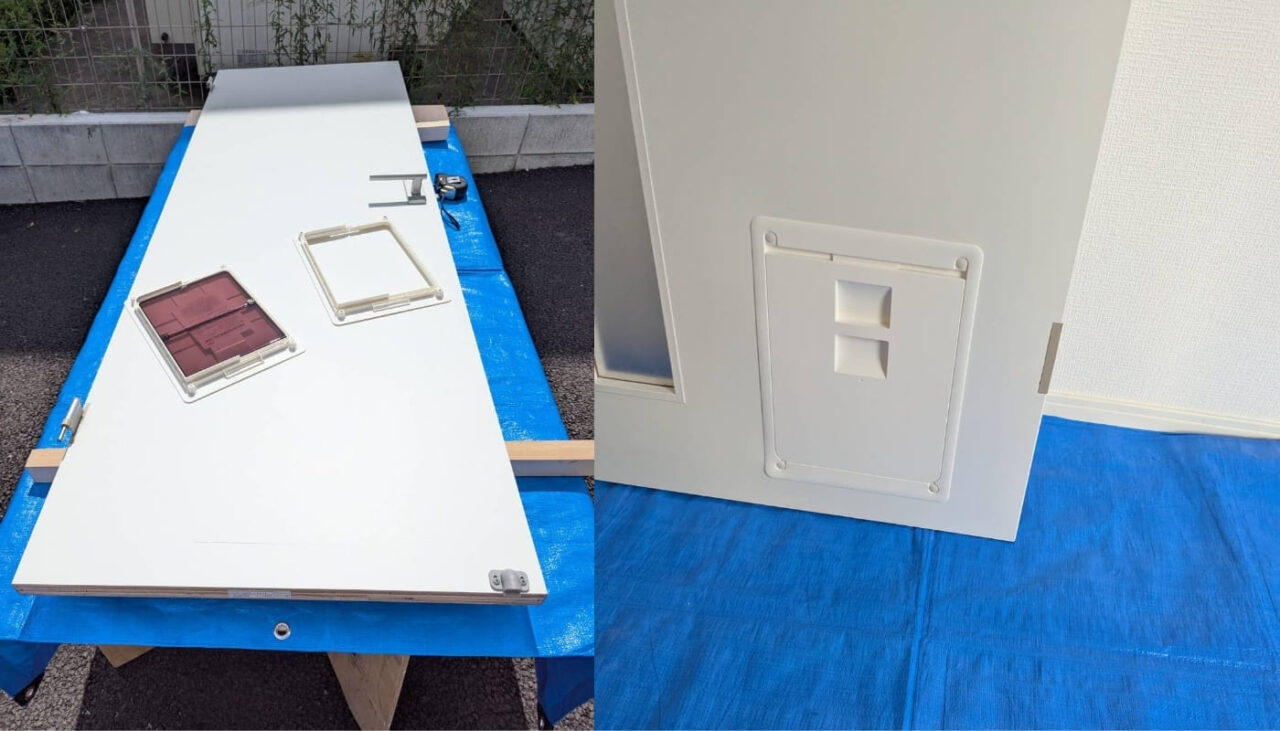 相模原市にて、室内扉を加工し、ペットが自由に出入りできる「ペットくぐーる」の取り付け作業を行いました。既存のドアの下部を適切なサイズで開口し、製品をしっかりと固定することで、安全かつスムーズに通れるペット専用の通路を設置いたしました。